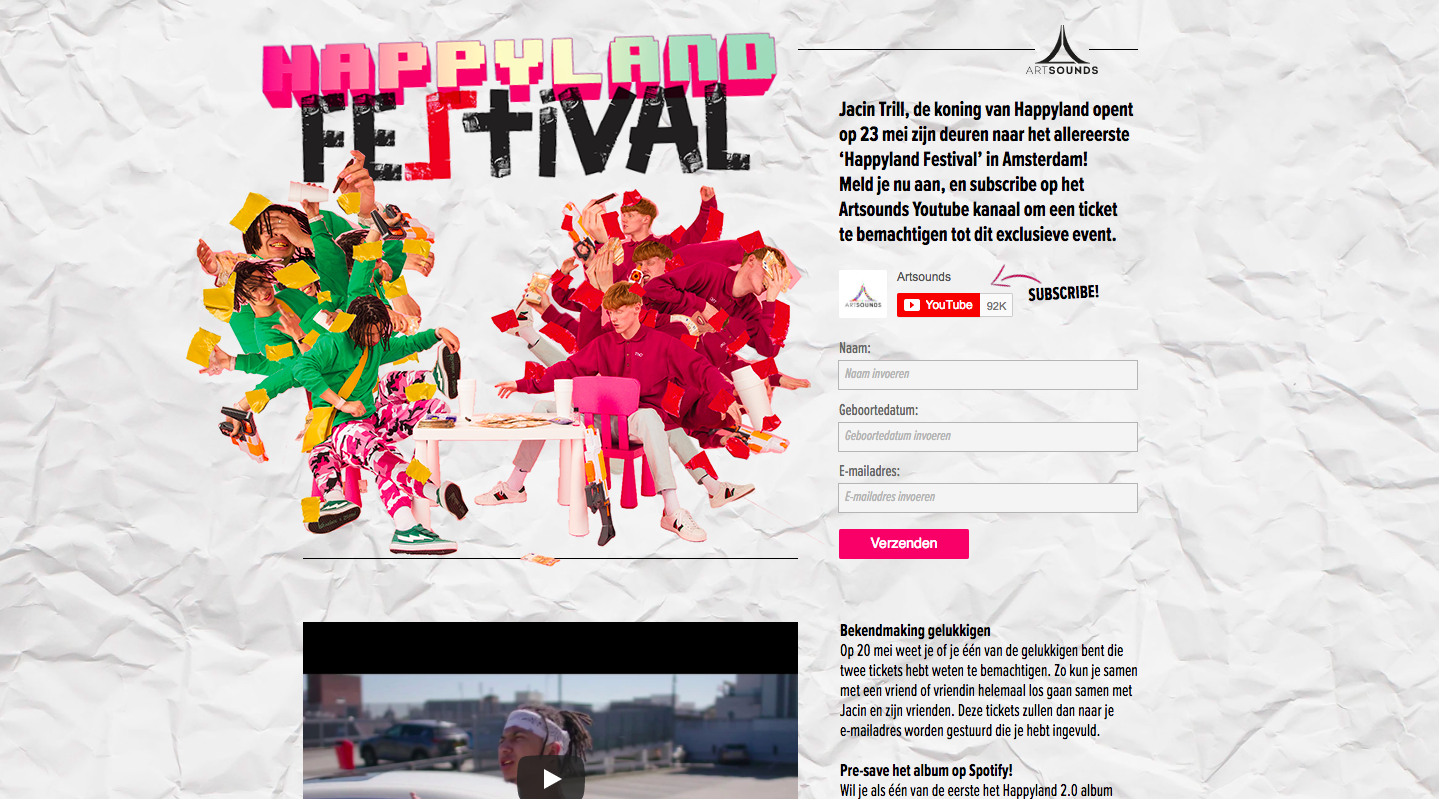 Het grootste rap talent van Nederland heet Jacin Trill en is getekend bij het label Artsounds. Zowel nationaal als internationaal staat hij inmiddels overal op de radar. Het uitbrengen van zijn album ‘Happyland 2’, en daarbij het ontwikkelen van een ‘360 graden marketingstrategie’ vergde een aanpak die zowel online als offline maximale impact zou hebben.