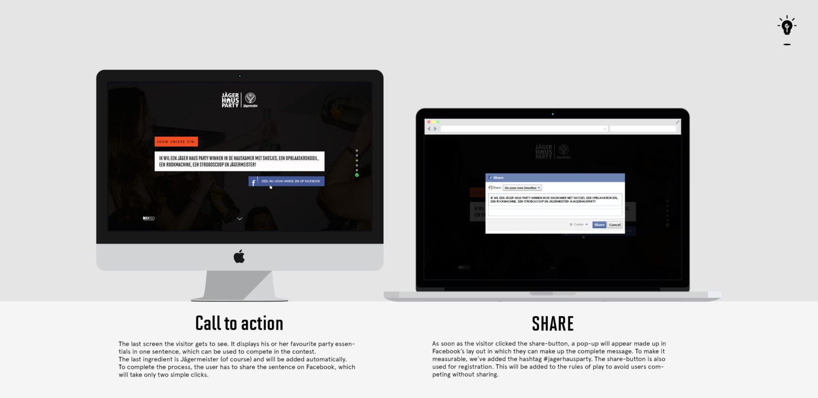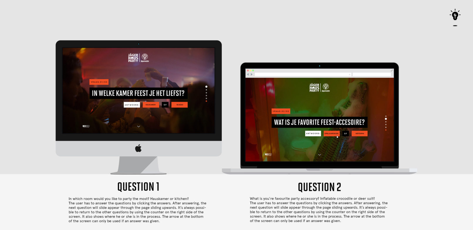 In samenwerking met Blueprint Media startten wij dit jaar (2016) met het designen van de digitale uitingen voor diverse campagnes van Jägermeister. Dit leidde om te beginnen tot het verzorgen van de art direction en gehele design van de Jäger Hausparty brand ID campagne. Met deze campagne wilde Jägermeister haar prijswinnaars belonen met een ultiem zelf samen te stellen huisfeest. Vervolgens bedachten wij samen met Blueprint Media het spelelement van de win-actie en zetten dit via concepting, code en design om in een prachtige campagne-wegsite (tevens voor mobile). Daarbij namen wij ook het design van de social assets voor onze rekening, en verzorgden wij samen met Since’88 de creatieve input (idee + script) en uitvoer (productie) van de 3 promotionele video’s. Bovendien creëerden wij alle designs t.b.v. de activatie van de gehele campagne bij de retailers door het land.